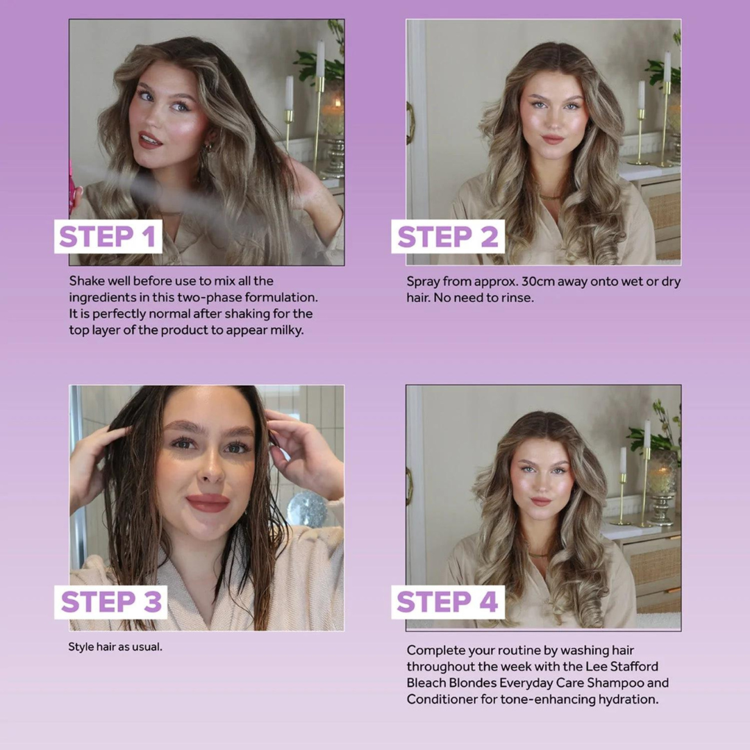 Litavarnarsprey sem ver ljósa litinn þinn gegn áhrifum sólar, klórs og salts. Vökvinn mýkir einnig hárið og losar um flækjur án þess að þyngja það. Hjálpar þér að viðhalda fallegum tón í ljósa hárinu þínu ásamt því að gefa því raka, mýkt og aukinn glans. Fullkominn ferðafélagi í sundtöskuna eða hvar sem sólin skín. Ráð frá Lee: Til þess að verja hársvörðinn fyrir sólbruna er gott að greiða hárið í tagl eða breyta skiptingu hársins yfir daginn.