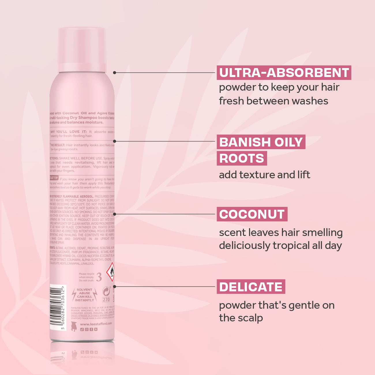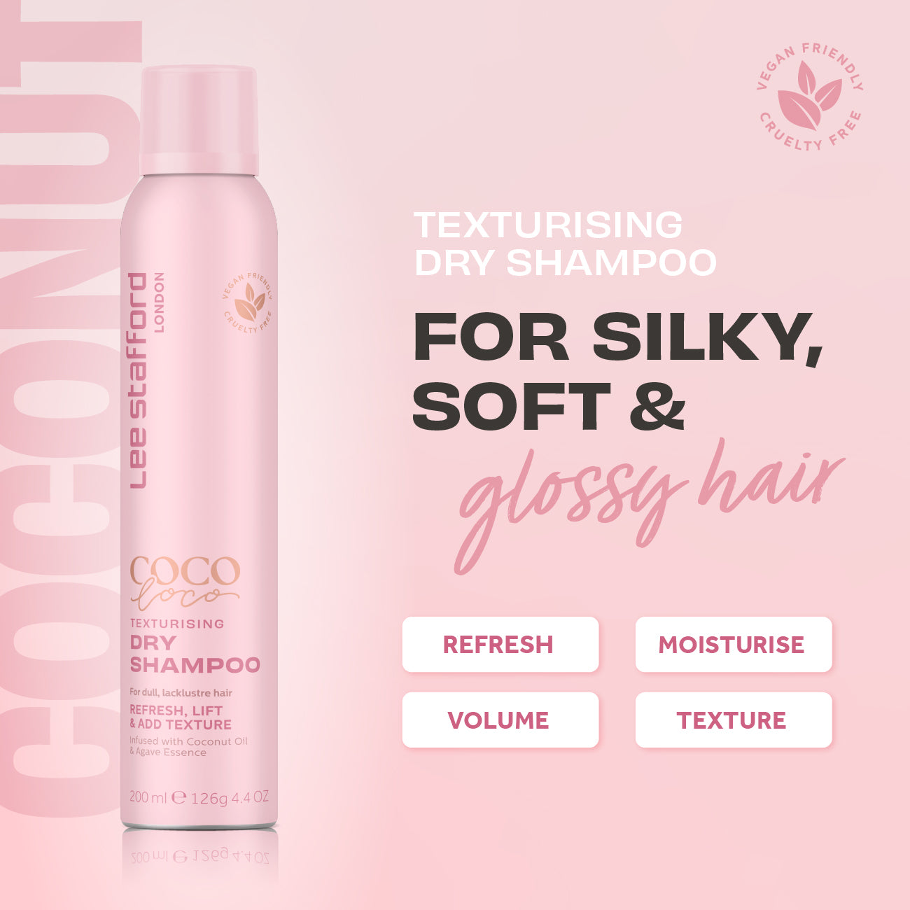 CoCo LoCo þurrsjampóið inniheldur fíngert púður sem dregur í sig umfram olíu til þess að lífga upp á ræturnar samstundis. Þetta sjampó í spreybrúsa frískar upp á hárið, endurlífgar það auk þess að gefa því lyftingu og meiri áferð. Það er fullkomið fyrir ferskt, stórt, fallegt hár, sem ilmar dásamlega kókoshnetulega dag sem nótt.