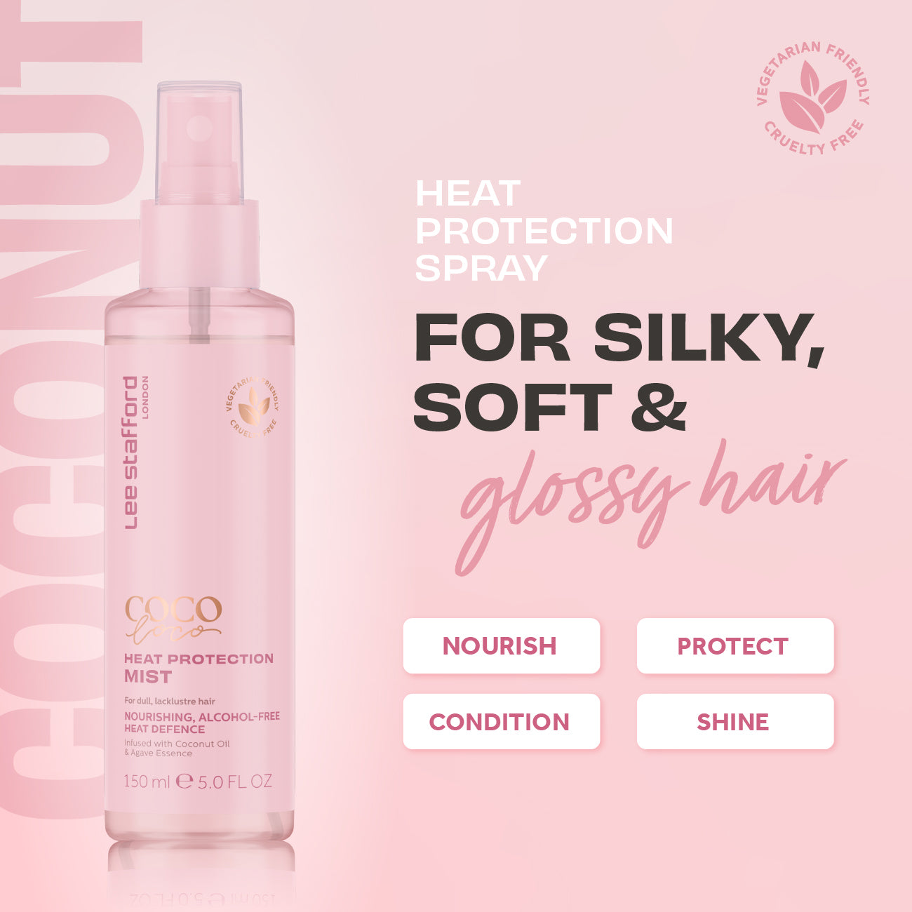 Þetta létta kókossprey hjálpar þér að vernda hárið frá skemmandi áhrifum hitamótunartækja líkt og hárblásurum, sléttu- og krullujárnum. Það inniheldur kókosolíu og heldur nærandi verndarhendi yfir hárinu þínu upp að 220°C. Vörnin sléttar úr hárinu, temur litlu hárin, heldur frá stöðurafmagni auk þess að hárið verður sterkara, heilbrigðara og fær á sig meiri gljáa.