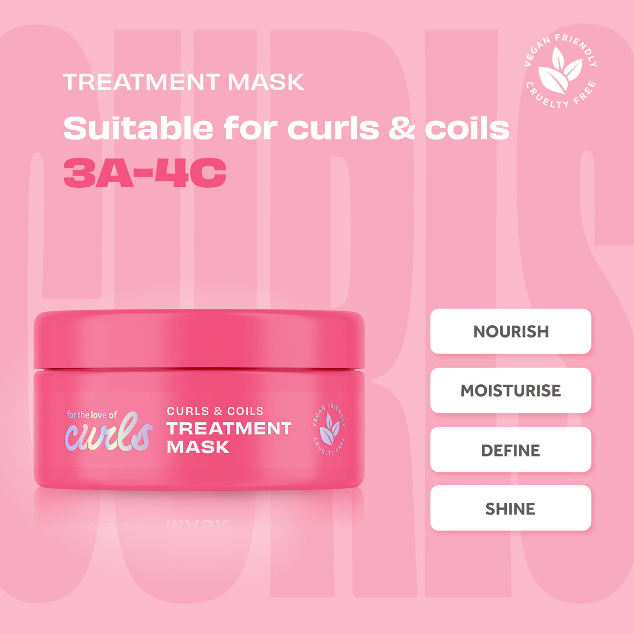 Öflug rakagefandi meðferð fyrir krullað hár til þess að lagfæra og styrkja auk þess að draga úr klofnum endum. Hármaskinn leitar uppi og lagar þurrar og skemmdar krullur þannig að þær verði sterkari og mýkri. Maskinn dregur úr klofnum endum og gerir hárið viðráðanlegra. Málamiðlunarlaus hárumhirða fyrir krullur. 100% Curly Girl samþykkt, vegan og snýst um raka. Inniheldur Shea smjör, öflug prótín, pro-vitamin B5 og lífræna kókosolíu til þess að næra og róa krullurnar þínar. Við vitum að krullað hár getur verið þurrara og viðkvæmara en aðrar hártýpur, þess vegna er raki aðalatriðið í For The Love Of Curls línunni. Þú finnur aldrei olíubyggð sílíkon, súlföt (SLS & SLES), þurrkandi alkóhól, steinefnaolíur eða steinefnavax í formúlunum okkar. Rakagefandi krullumaskinn okkar er blandaður úr náttúrulegu, sjálfbæru, nærandi og styrkjandi innihaldi sem krullurnar þínar eiga eftir að elska.
