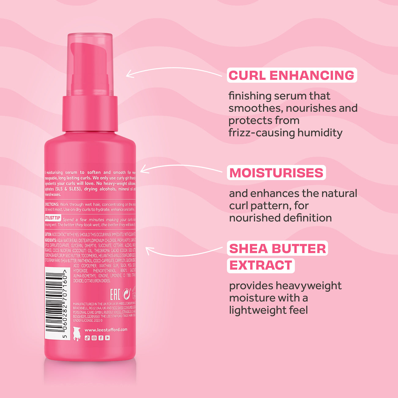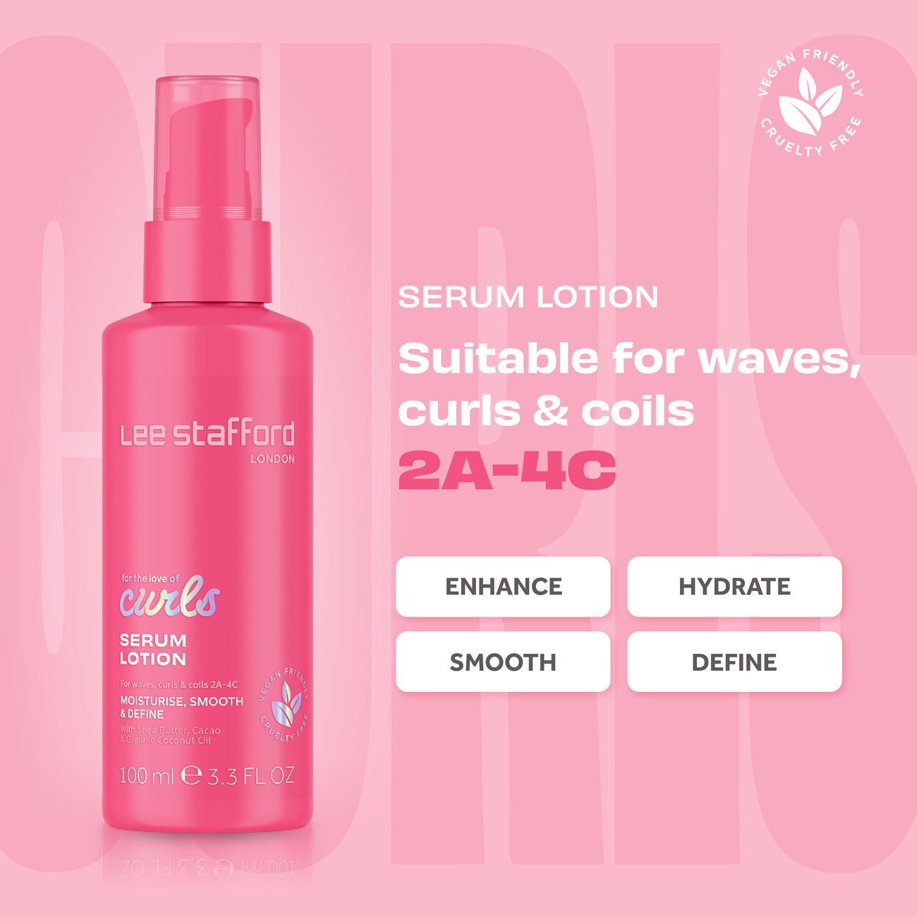 Létt en mjög nærandi rakaserum sem er fullkominn endir á hárrútínunni þar sem það ýtir undir krullurnar þínar án þess að þyngja þær. Sérstaklega hannað fyrir liði og krullur frá 2A til 4C og ýkir þitt náttúrulega krullumynstur. Þróað til þess að læsa inni næringuna og vernda gegn raka í andrúmsloftinu þannig að krullurnar endist lengur. Serumið inniheldur Shea smjör, kakó og lífræna kókosolíu til þess að gefa raka og mýkja blautt hár þannig að krullurnar vera viðráðanlegri. Þetta litla serum hjálpar þér einnig í baráttunni við úfið hár „frizz“ og er þá notað í þurrt hár til þess að lífga upp á það. Málamiðlunarlaus hárumhirða fyrir krullur. 100% Curly Girl samþykkt, vegan og snýst um raka. Við vitum að krullað hár getur verið þurrara og viðkvæmara en aðrar hártýpur, þess vegna er raki aðalatriðið í For The Love Of Curls línunni. Þú finnur aldrei olíubyggð sílíkon, súlföt (SLS & SLES), þurrkandi alkóhól, steinefnaolíur eða steinefnavax í formúlunum okkar. Serum kremið okkar fyrir liði og krullir er blandað úr náttúrulegu, sjálfbæru, nærandi og styrkjandi innihaldi sem krullurnar þínar eiga eftir að elska.