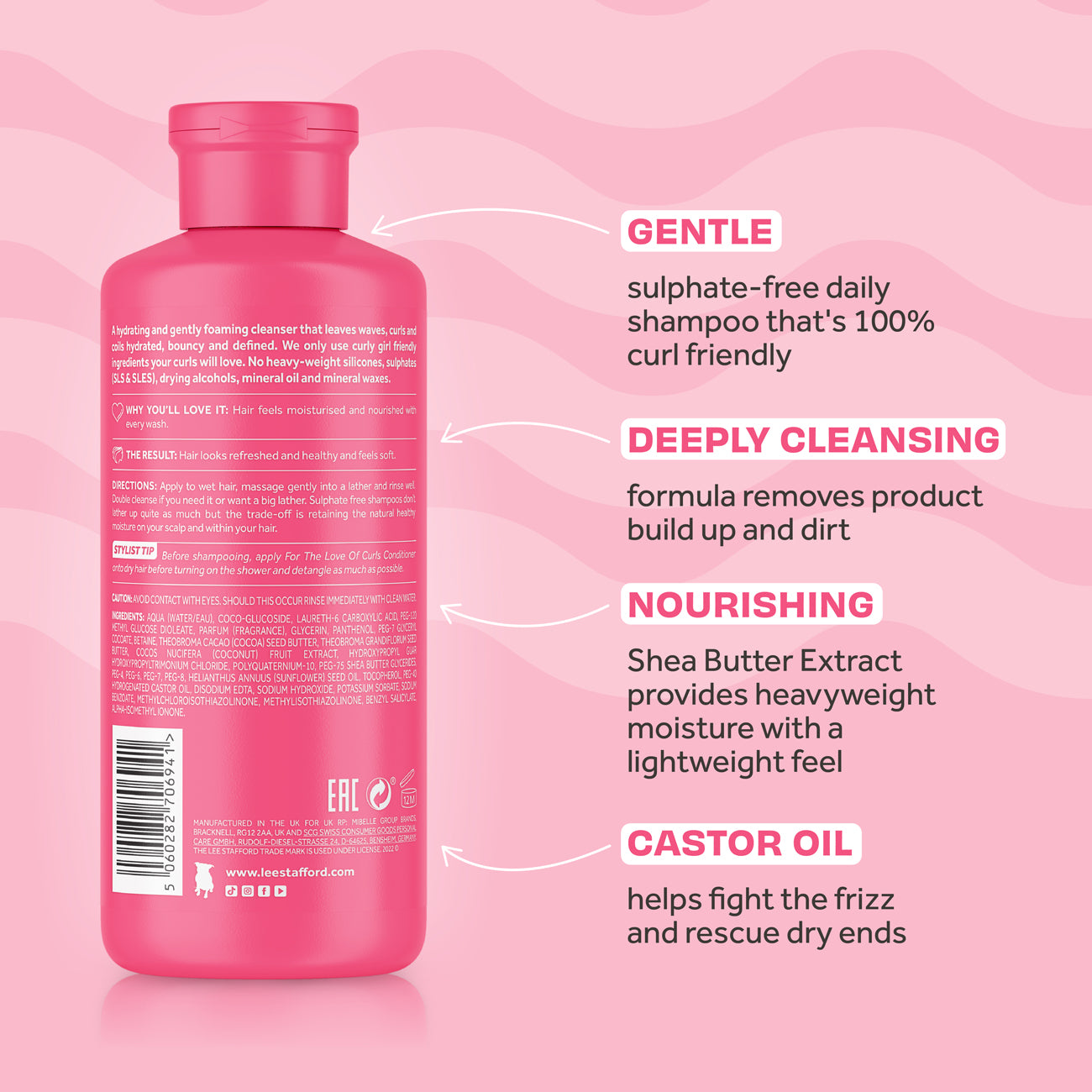 Súlfatlaust krullusjampó sem gefur liðum og krullum aukna næringu, mótun og fyllingu. Inniheldur Shea smjör, kakó og kókosvatn fyrir milda hreinsun, raka, mýkt og til þess að draga úr úfnum lokkum eða „frizz“. Fyrir allar krullutýpur frá 2A til 4C. Við vitum að krullað hár getur verið þurrara og viðkvæmara en aðrar hártýpur, þess vegna er raki aðalatriðið í For The Love Of Curls línunni. Þú finnur aldrei olíubyggð sílíkon, súlföt (SLS & SLES), þurrkandi alkóhól, steinefnaolíur eða steinefnavax í formúlunum okkar. Rakagefandi krullusjampóið okkar er blandað úr náttúrulegu, sjálfbæru, nærandi og styrkjandi innihaldi sem krullurnar þínar eiga eftir að elska. Málamiðlunarlaus hárumhirða fyrir krullur. 100% Curly Girl samþykkt, vegan og snýst um raka.