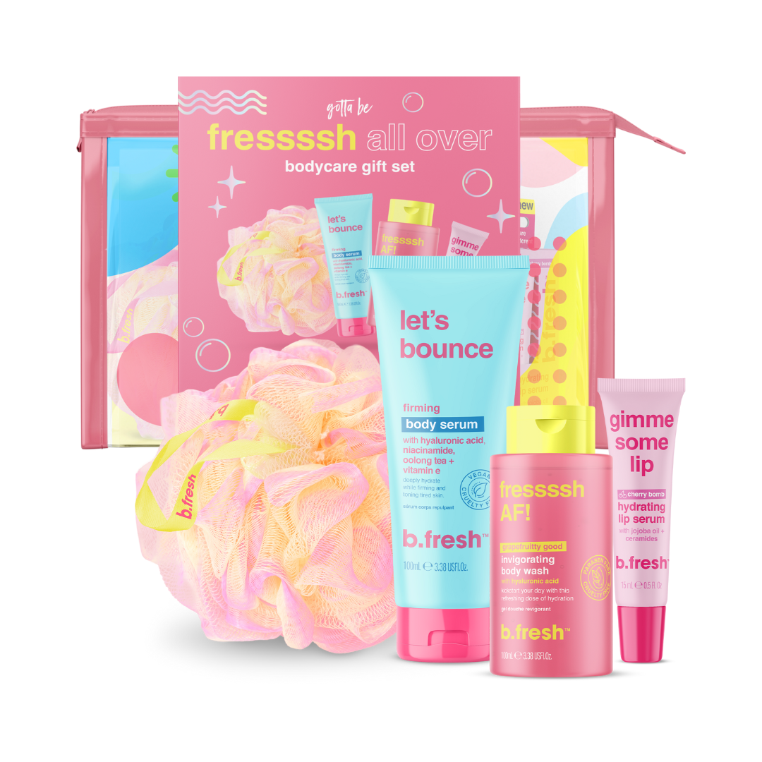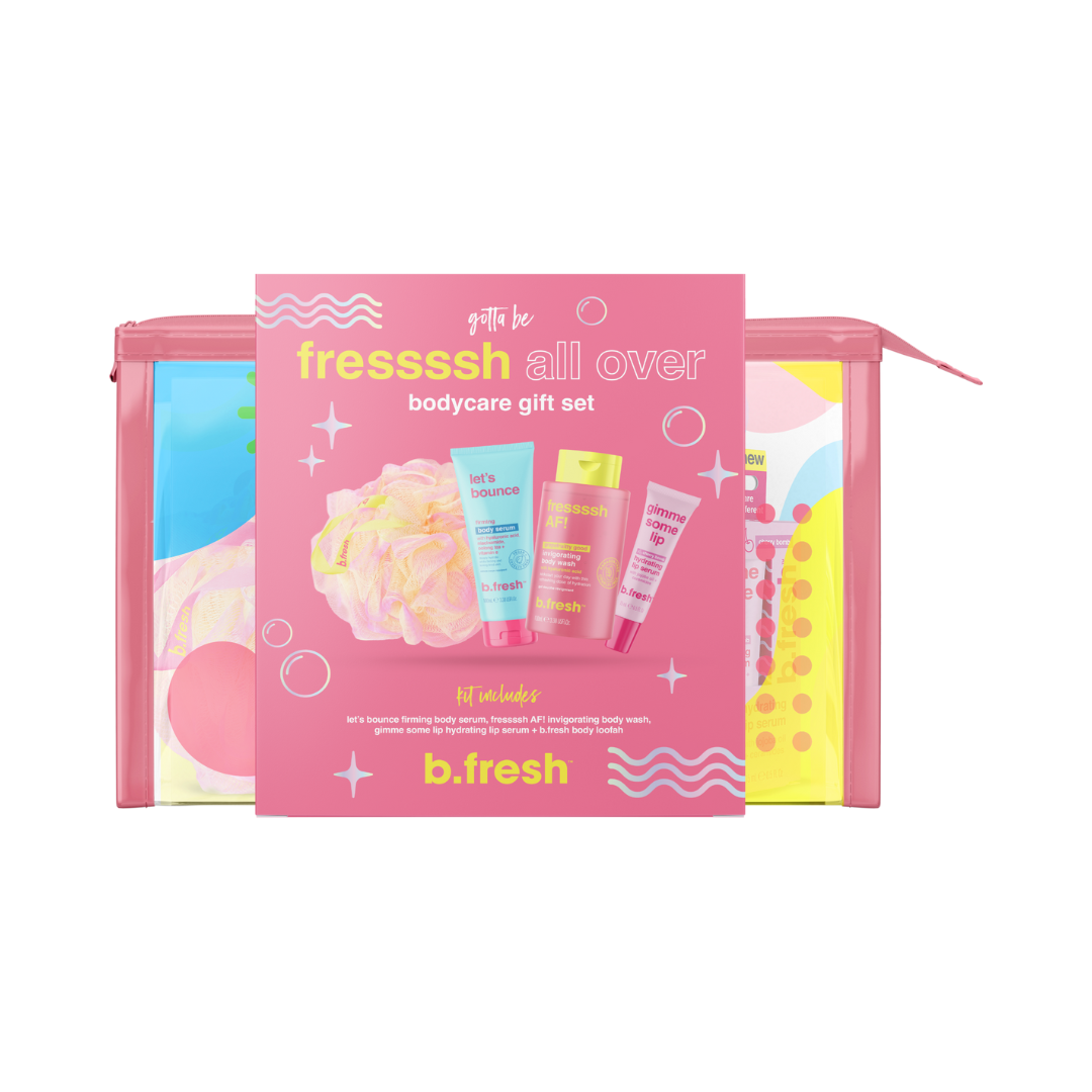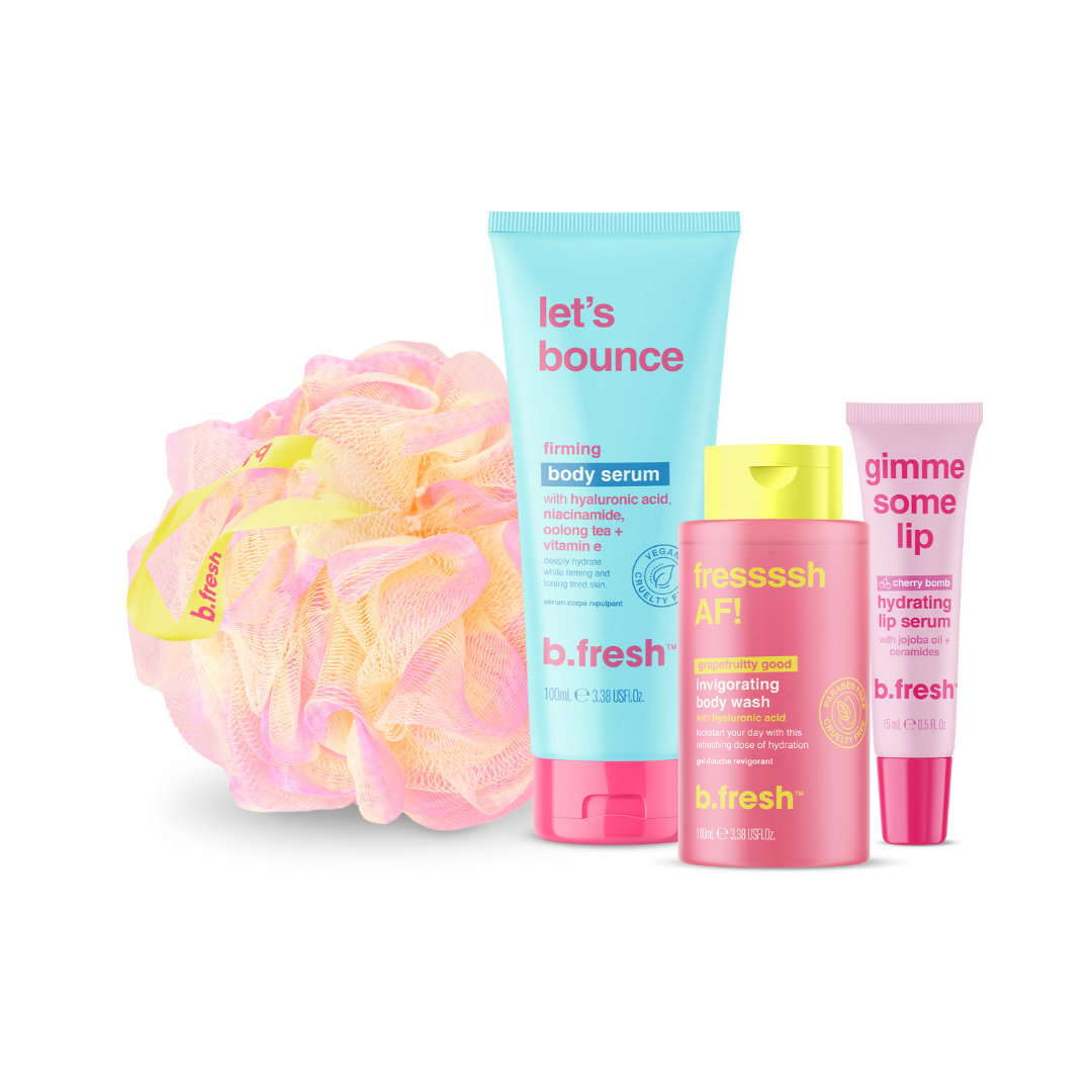 Inniheldur: Let´s Bounce body serum 100ml, Fressssh AF! body wash 100ml, Gimme Some Lip varaserum 15ml og b.fresh baðlilja (body loofah).