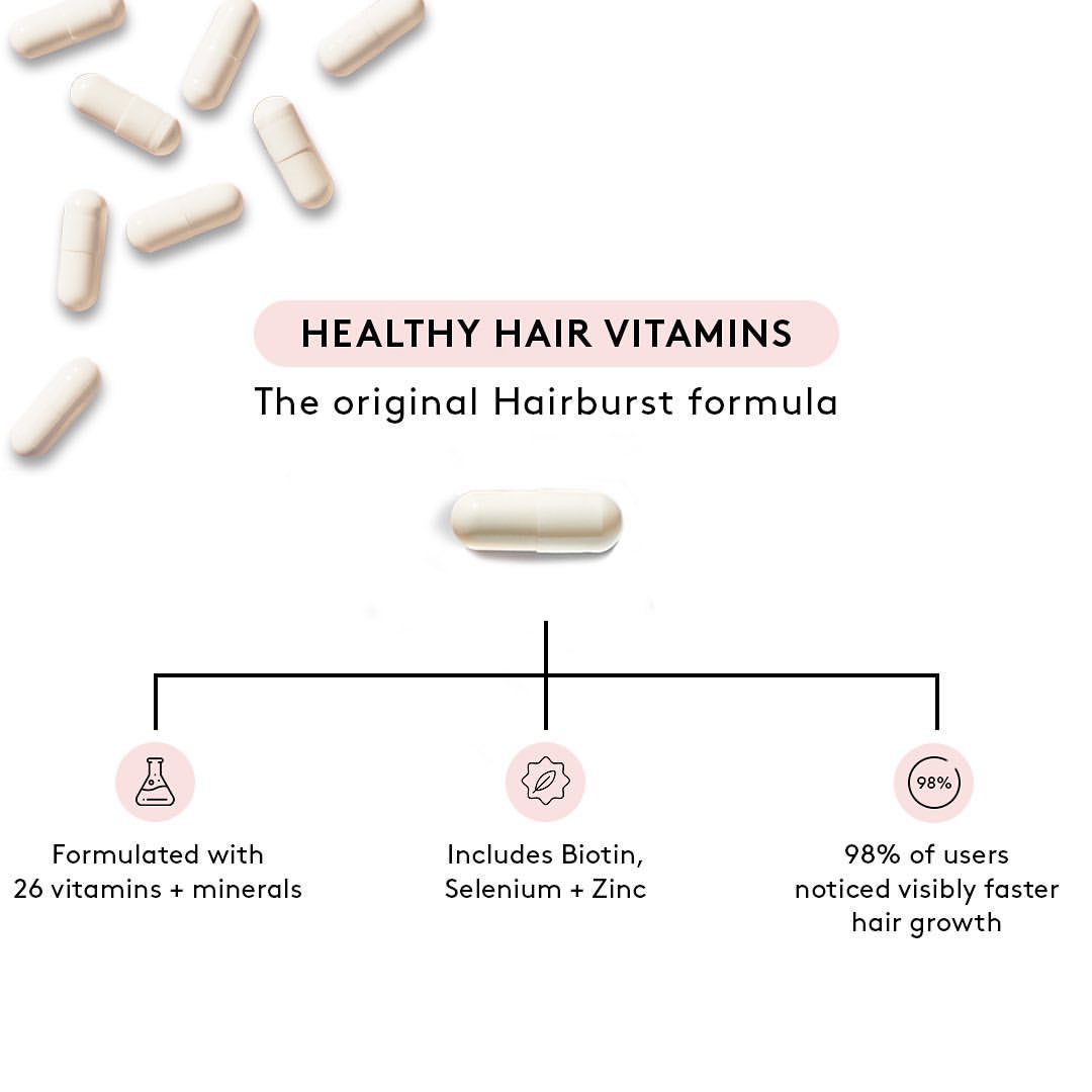 Hairburst Healthy Hair hárvítamín er einstök blanda virkra innihaldsefna sem örva hárvöxt, vinna gegn hárlosi og auka heilbrigði hársins. Vítamínið er samsett úr fyrsta flokks náttúrulegum efnum sem hjálpa þér að halda hárinu í vaxtarfasa eins lengi og mögulegt er. HairBurst hárvítamín inniheldur 26 vítamín og steinefni, þar á meðal kollagen sem er helsta uppbyggingarprótein líkamans og mikilvægt til að viðhalda heilbrigðum hárvexti.