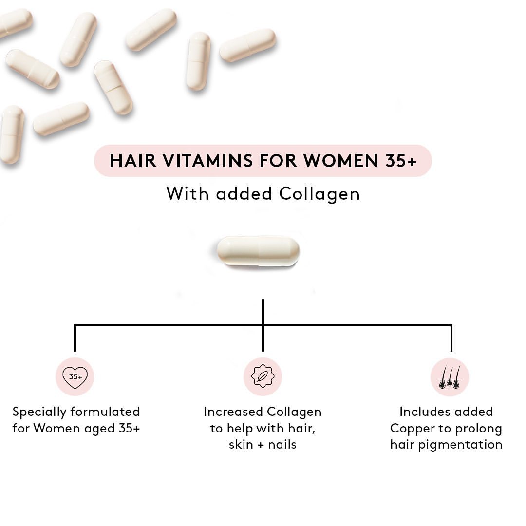 Vítamín hylkin innihalda öll helstu vítamín og steinefni sem örva og viðhald heilbrigðum hárvexti. Hylkin innihalda einnig meira magn af kollageni en hin vítamínin okkar en kollagen er eitt helsta uppbyggingarprótein líkamans og líkaminn framleiðir minna af því eftir því sem við verðum eldri. Hvert glas inniheldur 60 hylki en daglegur skammtur eru 2 hylki á dag.