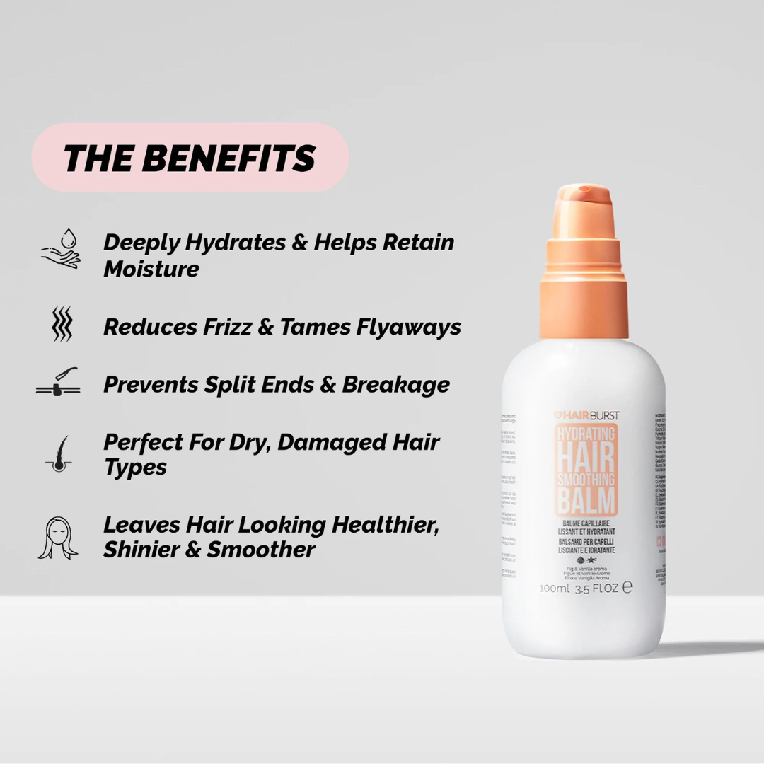 Hydrating Hair Smoothing Balm nærir og temur frizz á meðan það styrkir líka hárið! Auk þess kemur það í veg fyrir klofna enda sem stuðlar að heilbrigðari hárvexti. Sérstaklega hannað fyrir þurrt, skemmt og úfið hár.