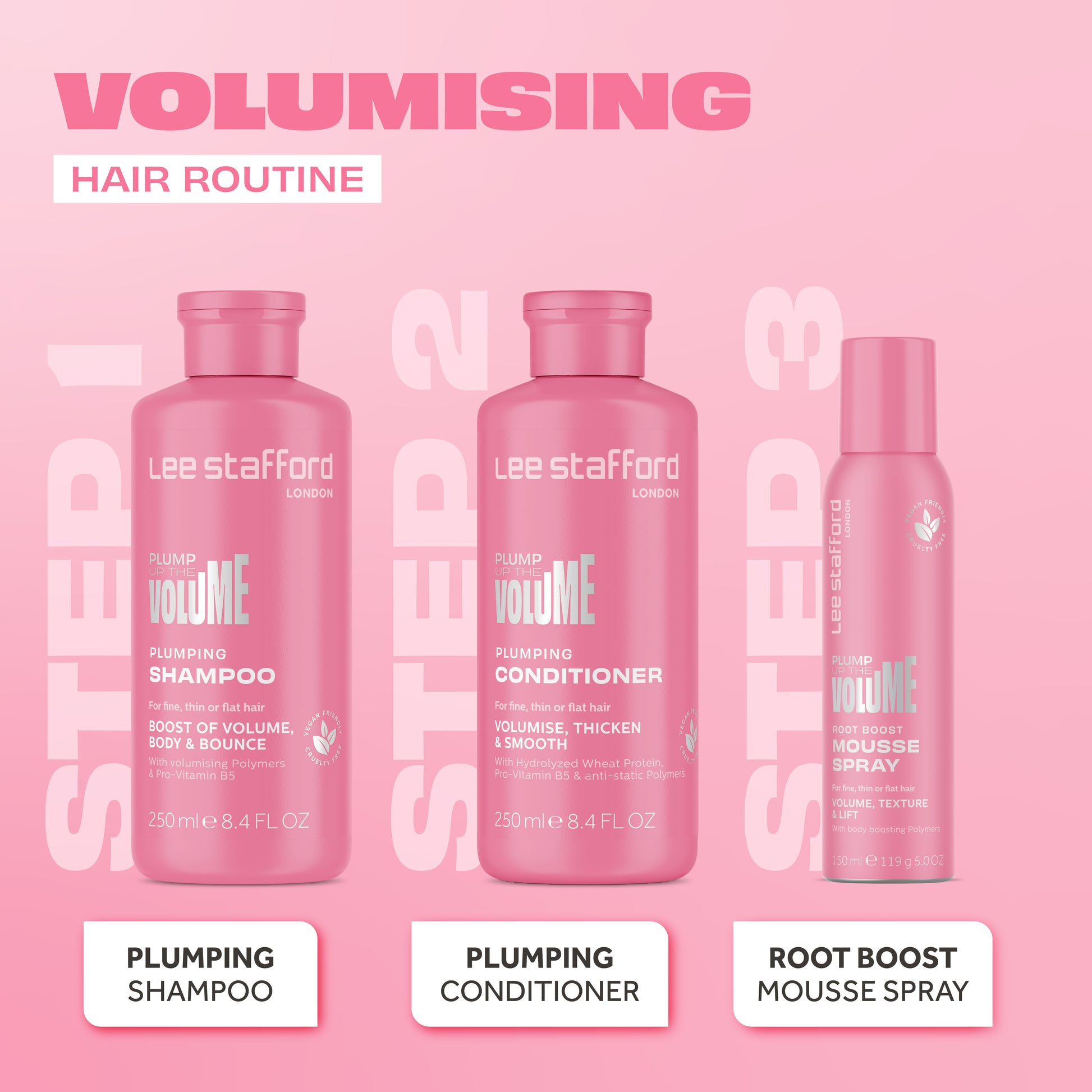 Skref 2: Berðu Volume Plumping hárnæringuna í lófana og dreifðu síðan jafnt í gegnum hárið. Lee Stafford Sturtugreiðan getur hjálpað hér. Láttu liggja í hárinu í eina mínútu svo hárstrendingarnir geti dregið í sig allt þetta volume aukandi góðgæti. Skolaðu hárið vandlega.