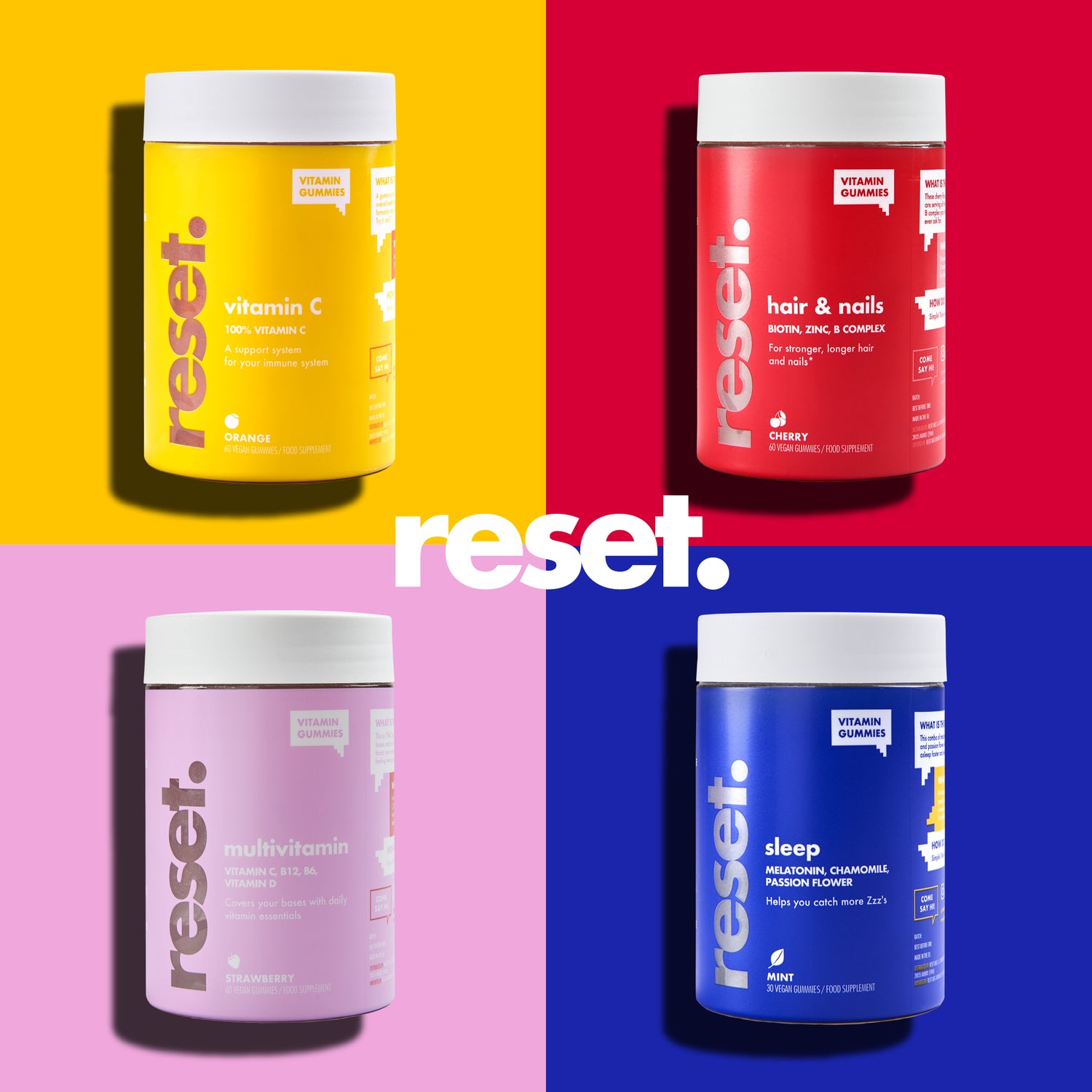 reset. vítamín gúmmí eru ótrúlega bragðgóð og auðveld leið til þess að muna eftir vítamínunum þínum. Öll reset. vítamínin eru: